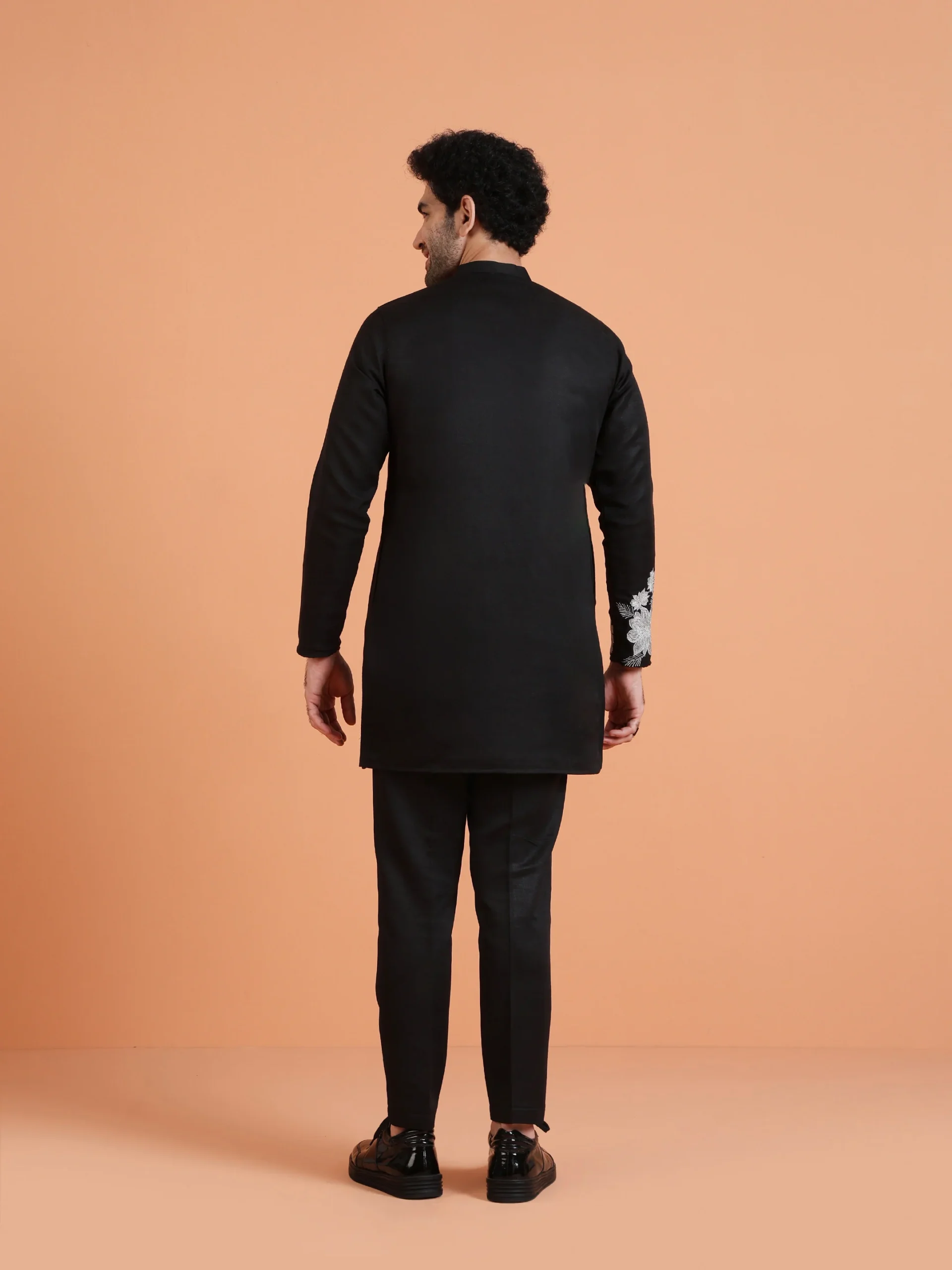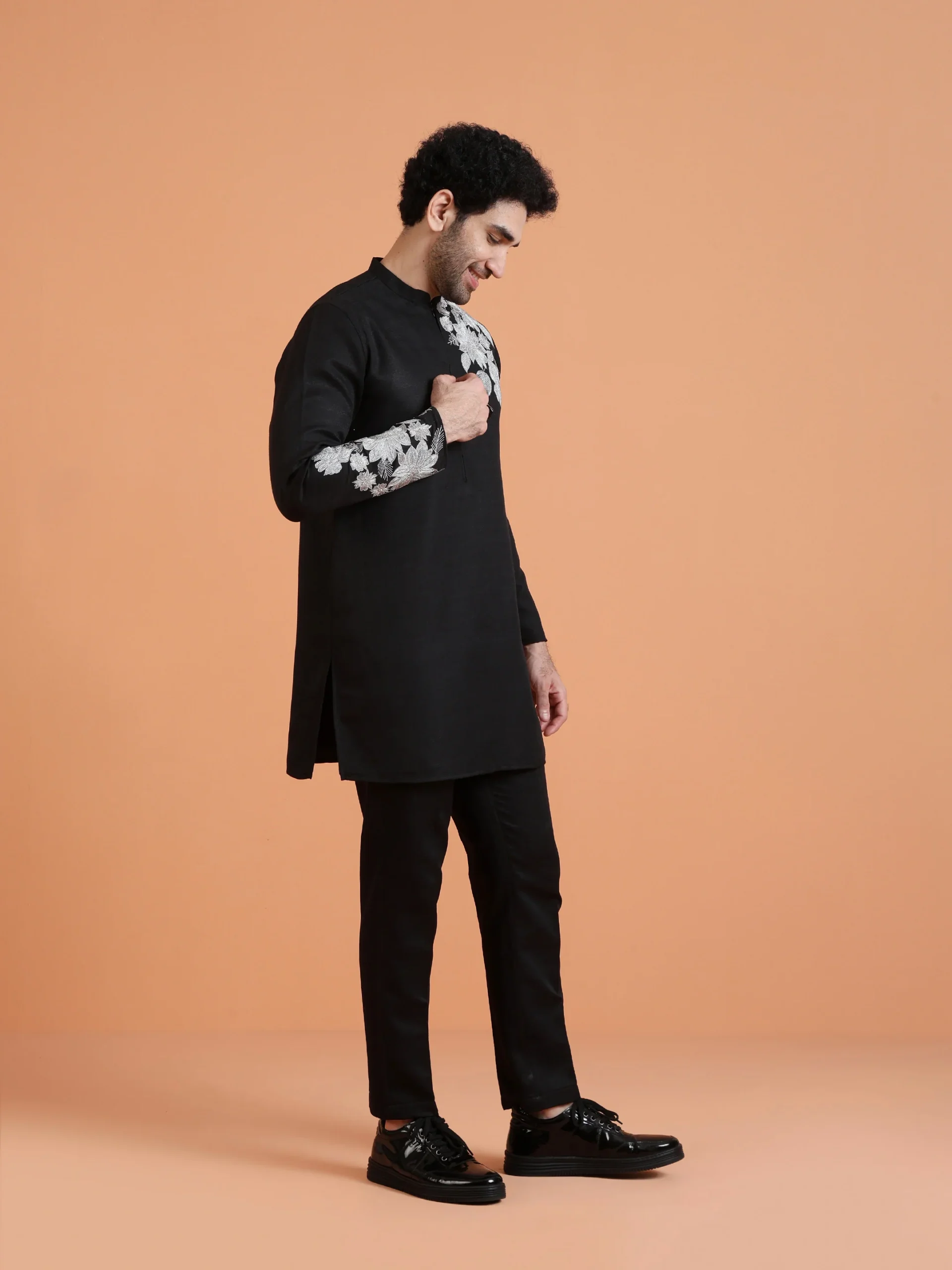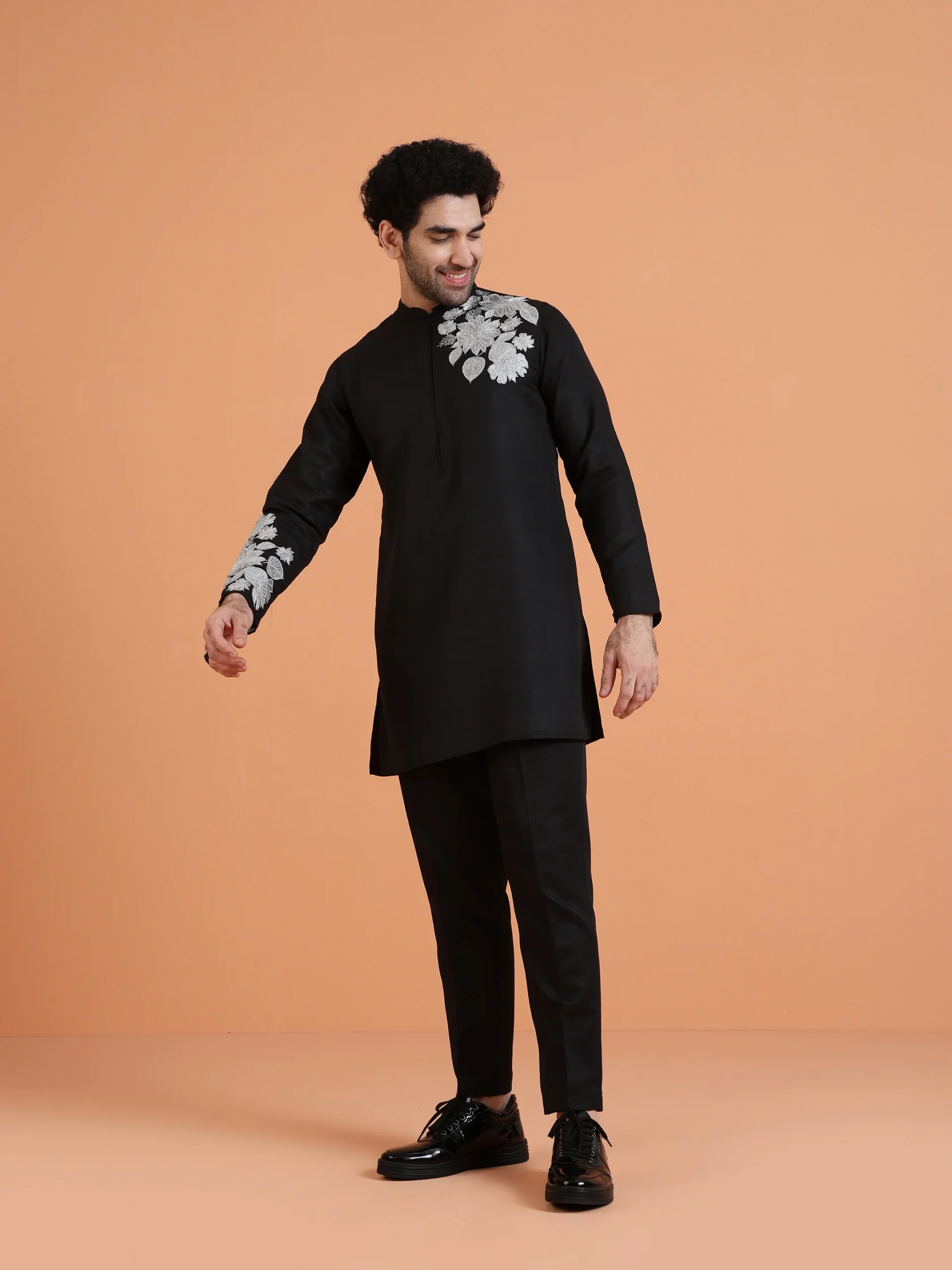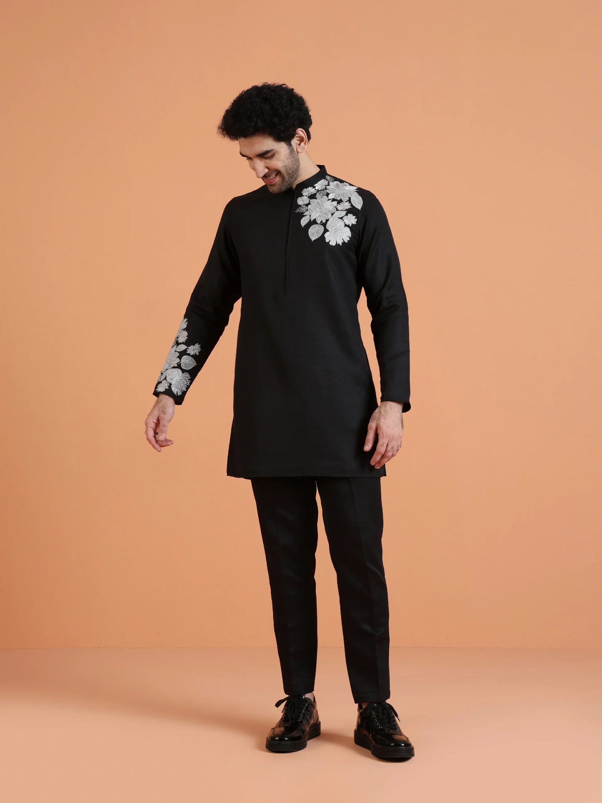 This Black Floral Embroidered Kurta with Black Trouser Set features tonal floral embroidery on a solid black base, creating a coordinated and structured ethnic ensemble suitable for formal celebrations.