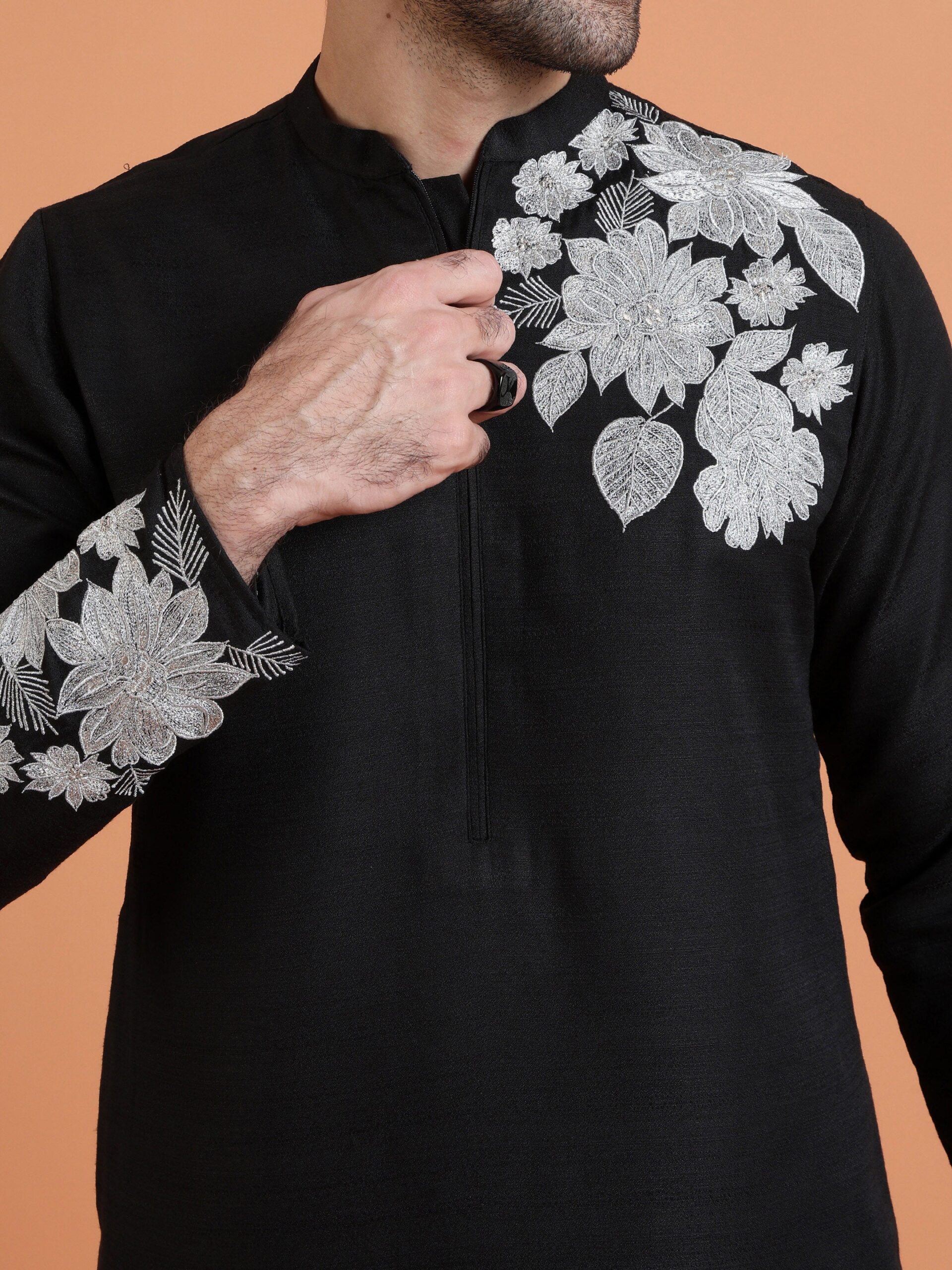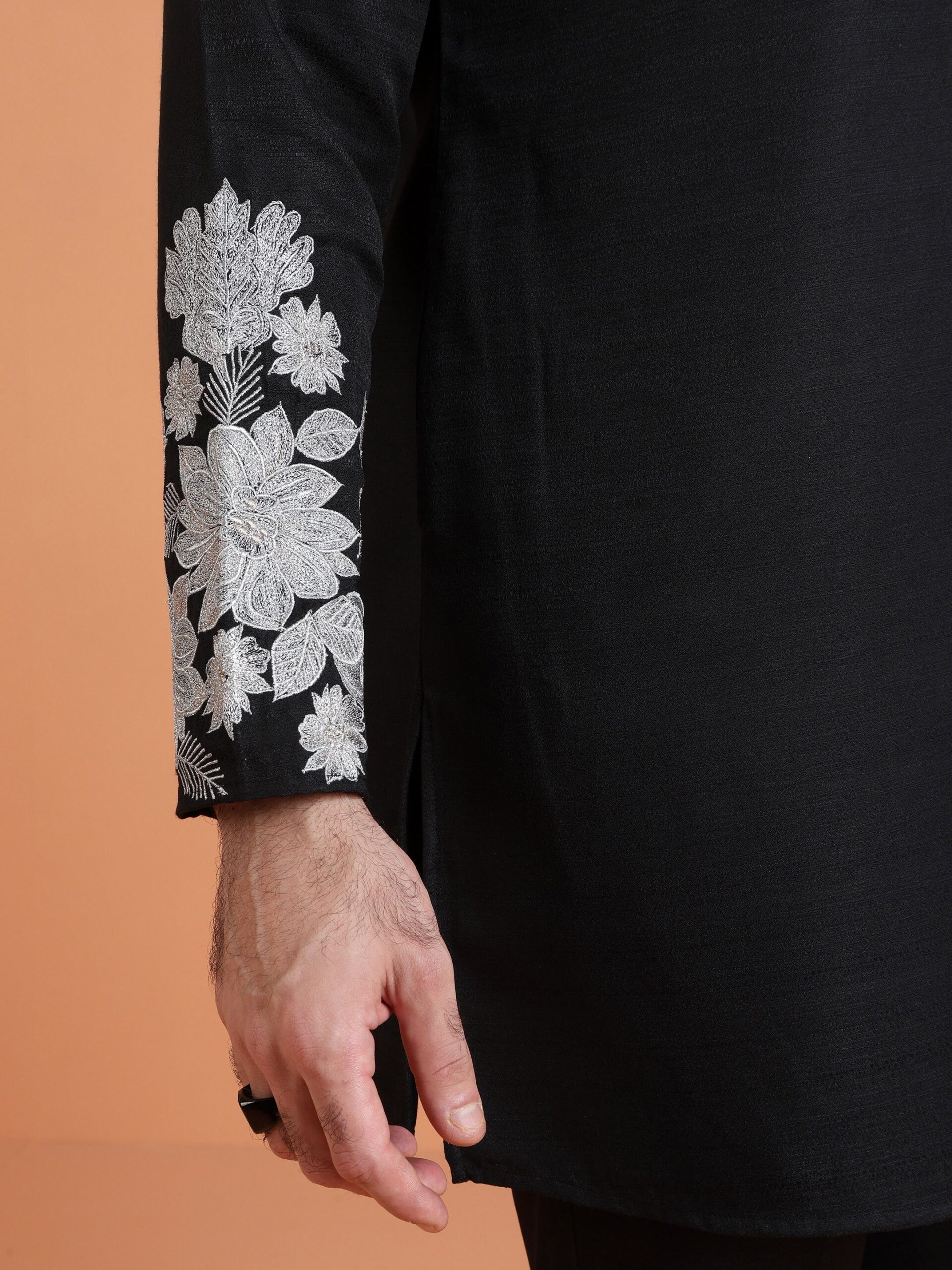 Men’s black floral embroidered kurta paired with matching black trousers. Crafted from silk blend fabric in a regular fit for weddings and festive occasions.
