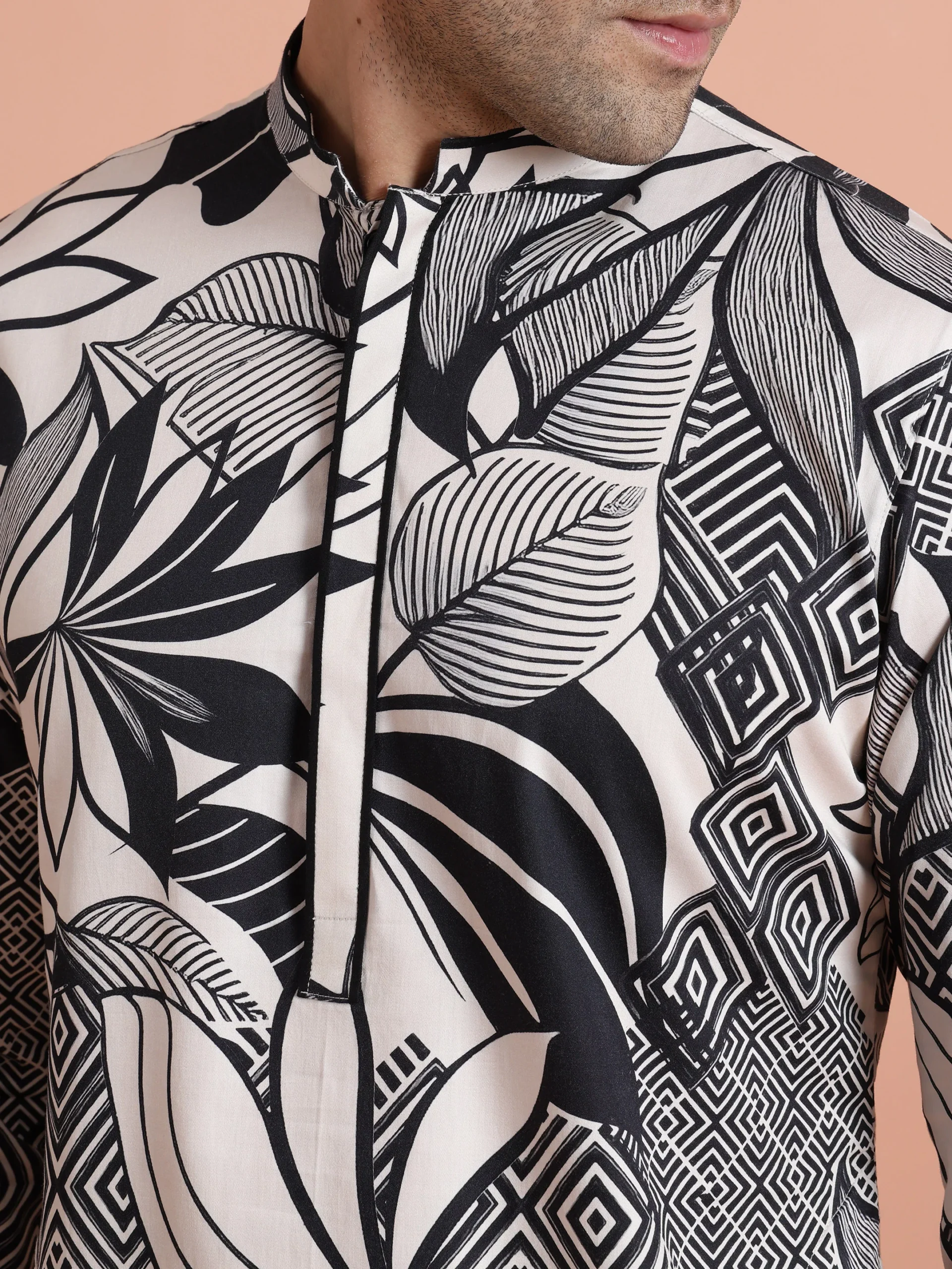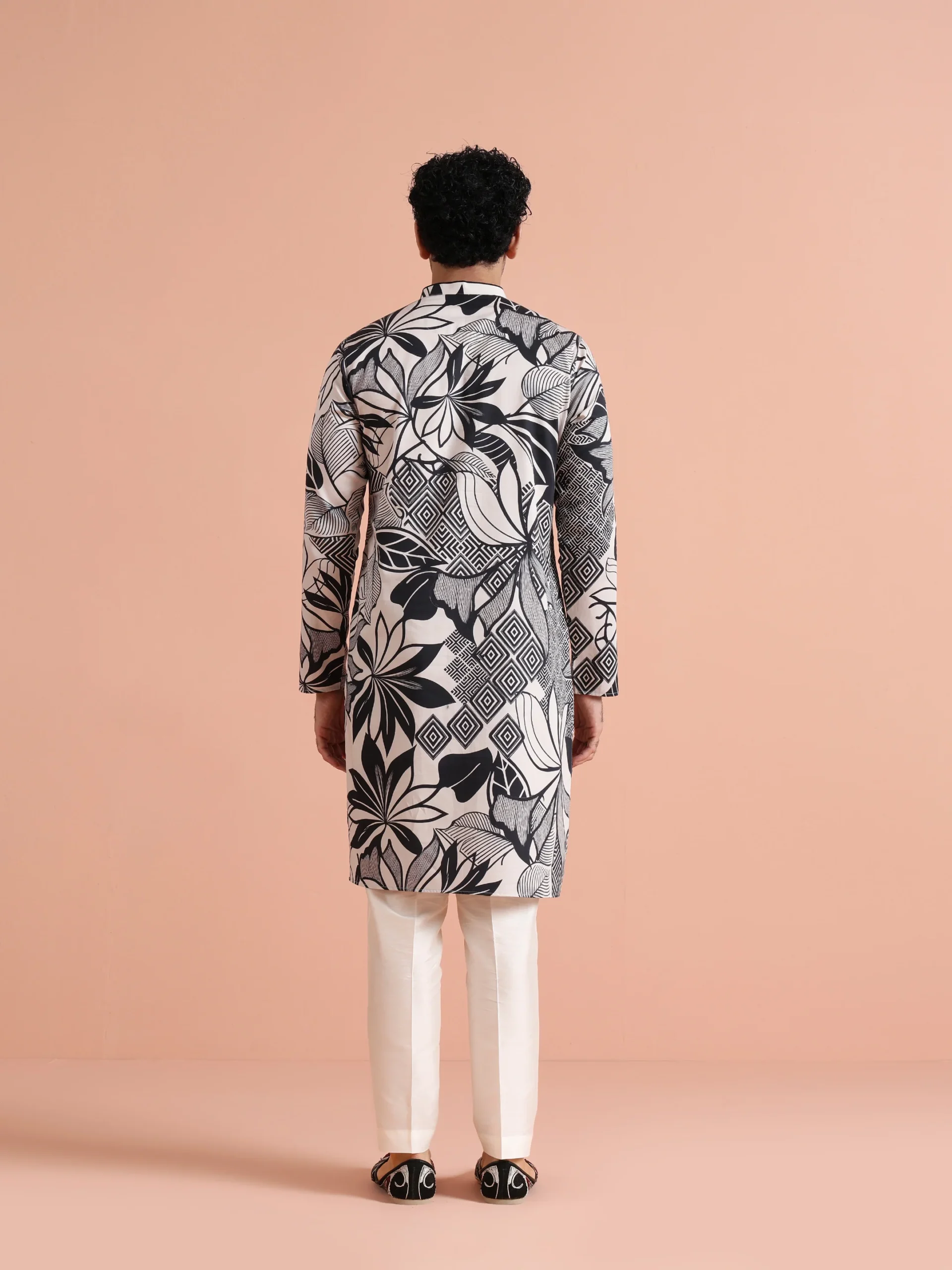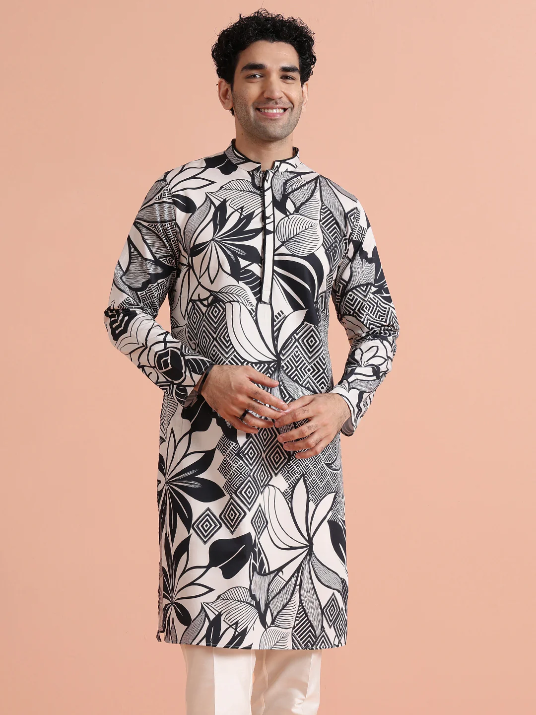 This Black & White Printed Long Kurta features a bold combination of floral and geometric motifs on a classic black base with contrasting white print. Designed with a regular fit and long silhouette, this kurta offers a timeless ethnic style suitable for celebrations and gatherings.
