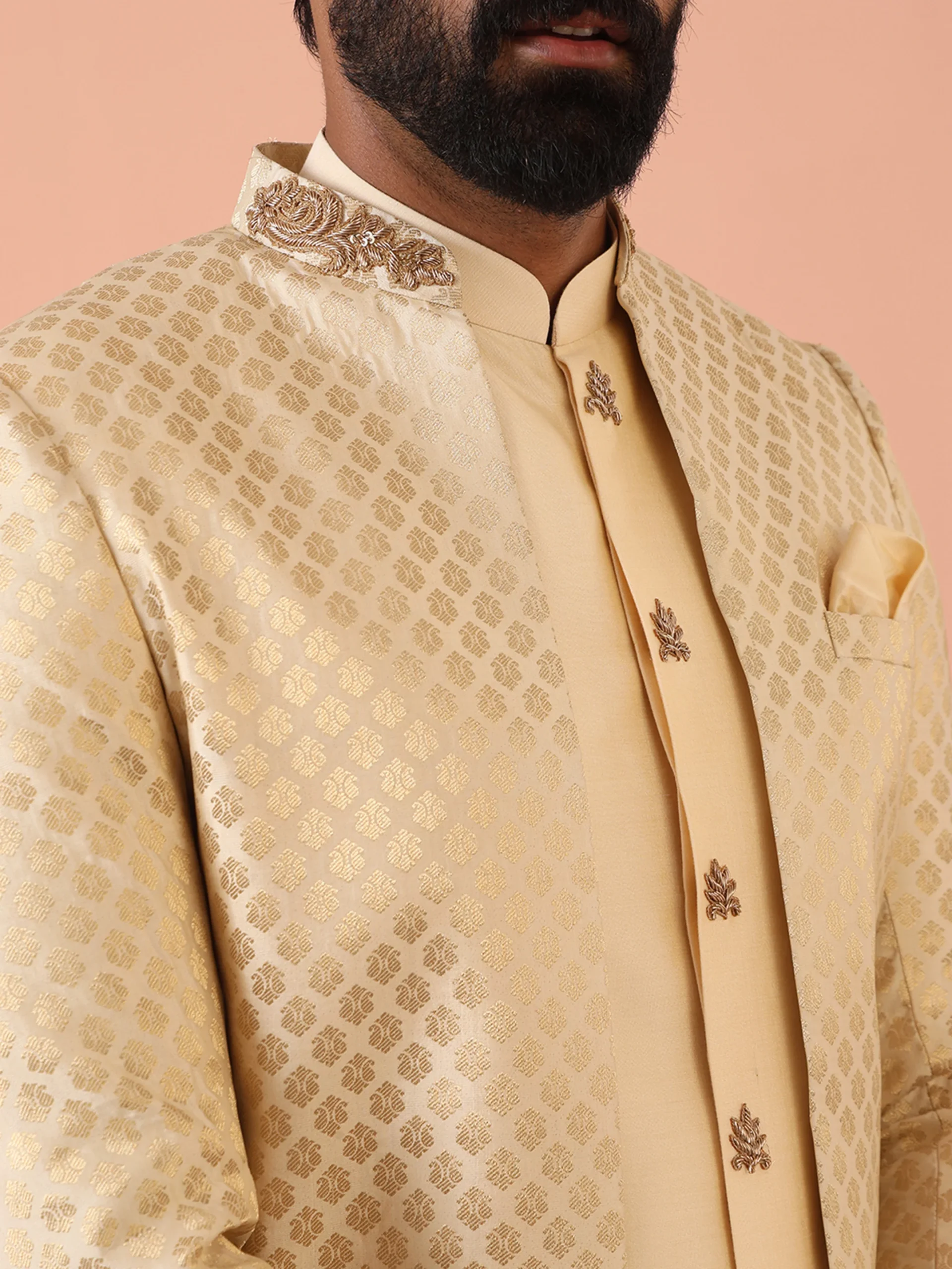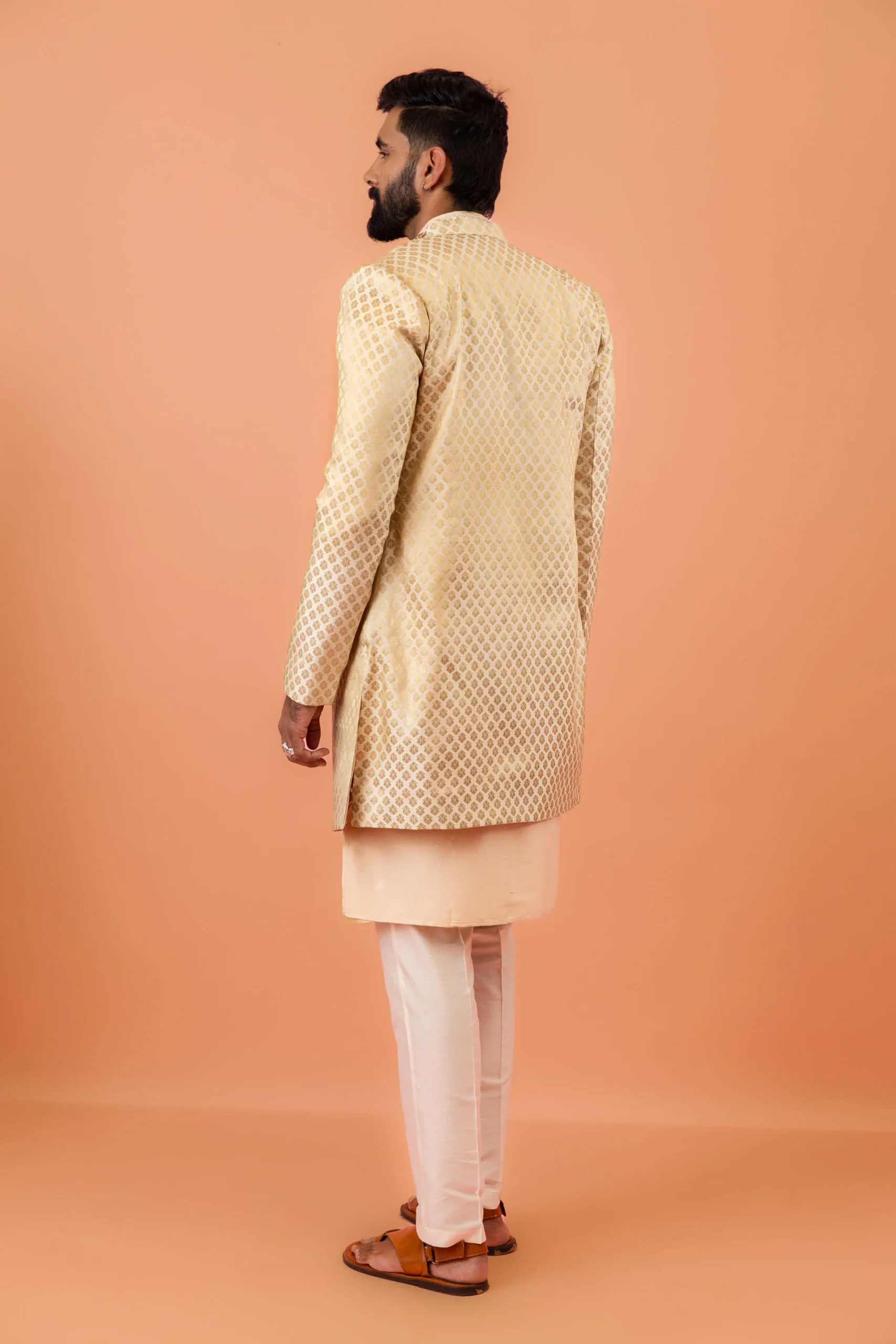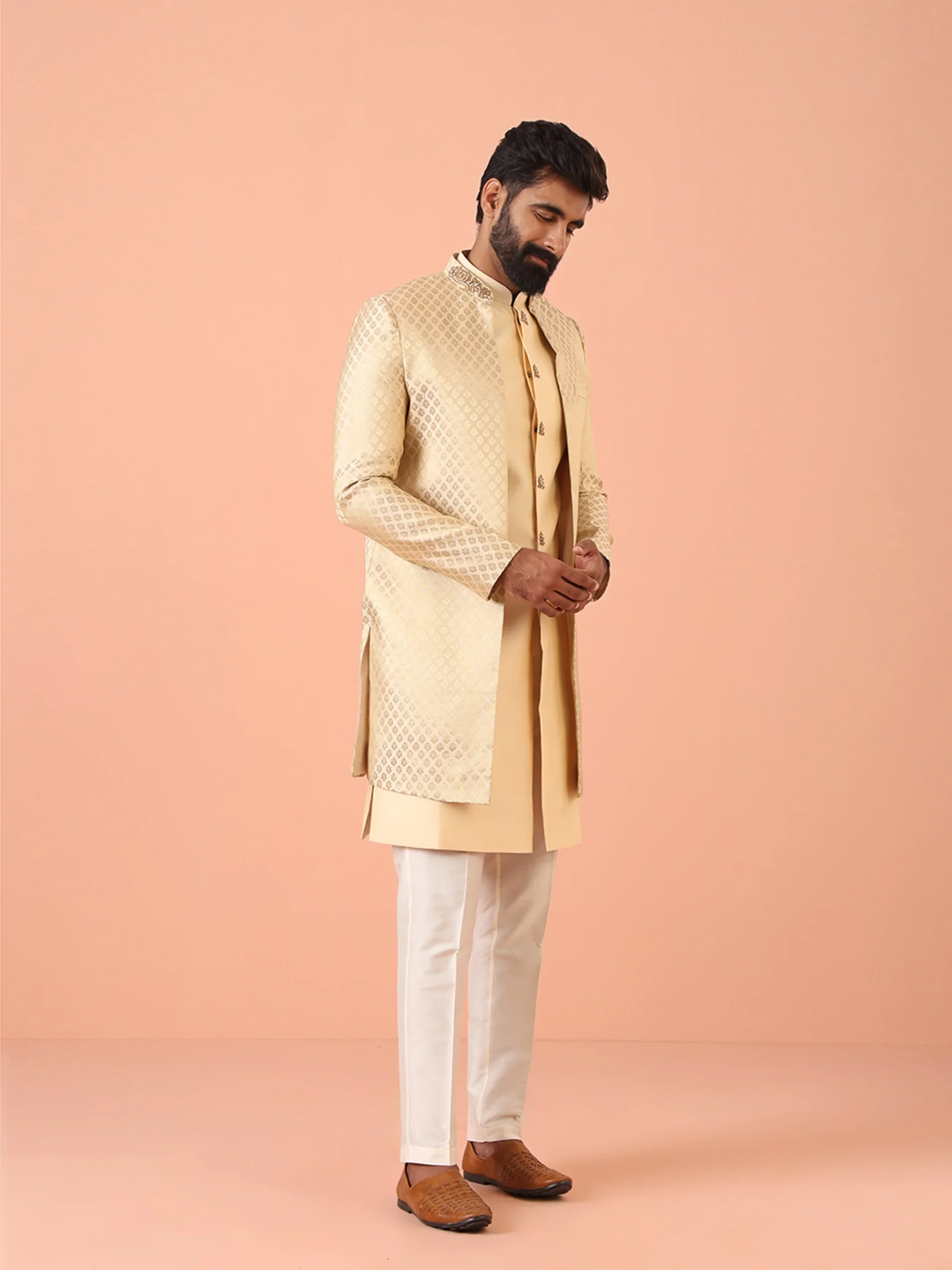 This Gold Silk Blend Textured Sherwani Trouser Set features a structured silhouette with a woven diamond texture. Designed for formal ethnic occasions, the coordinated sherwani and trousers provide a balanced and traditional appearance.