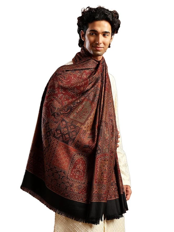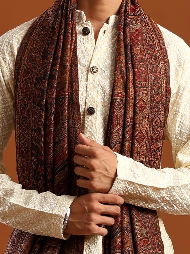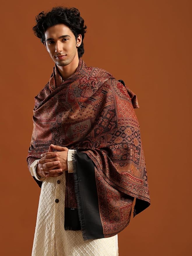 This Men’s Jamawar Wool Blend Shawl is inspired by traditional Jamawar motifs and adapted for contemporary ethnic wear. The woven floral pattern and balanced drape make it suitable for layering across festive, formal, and seasonal outfits.