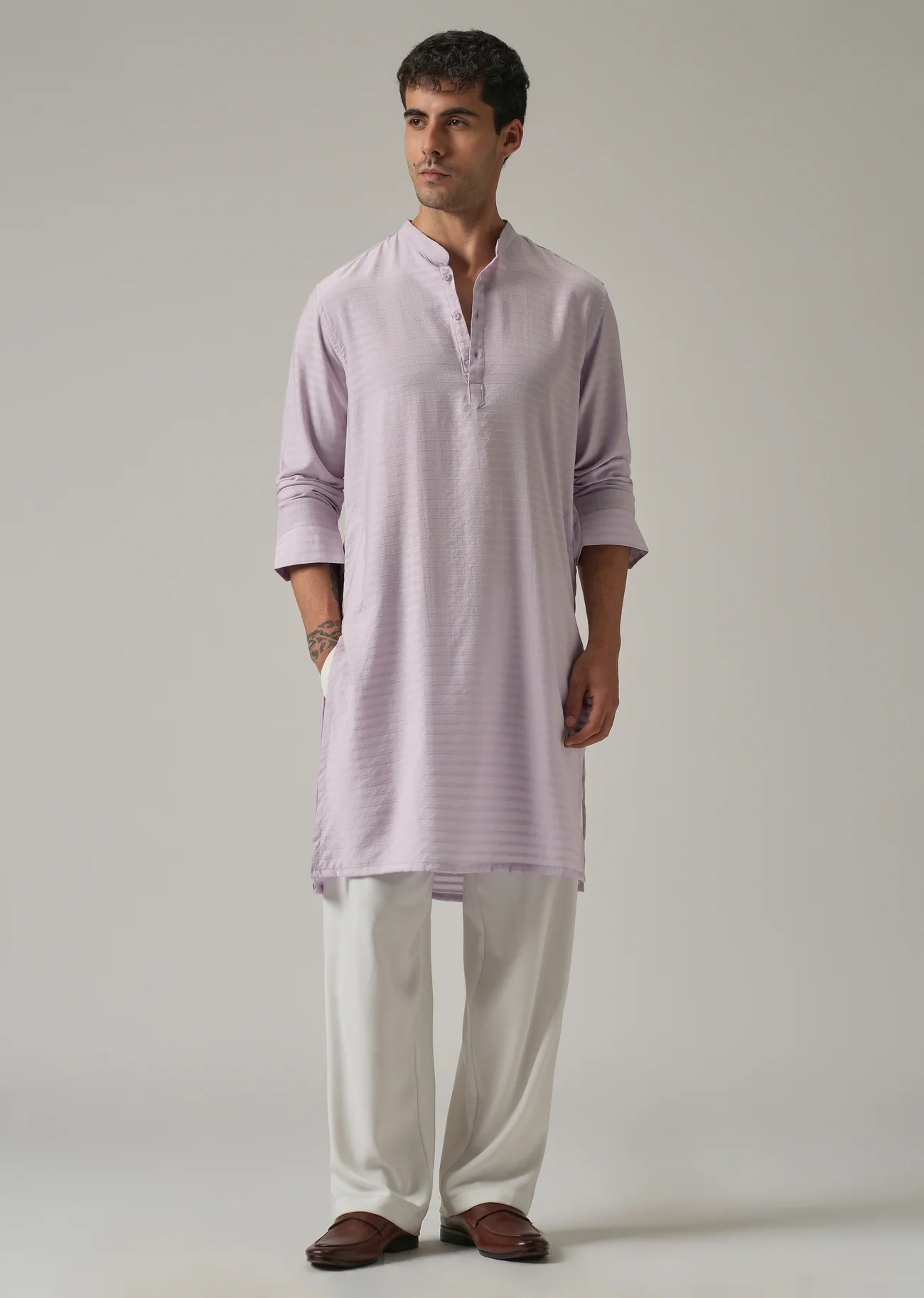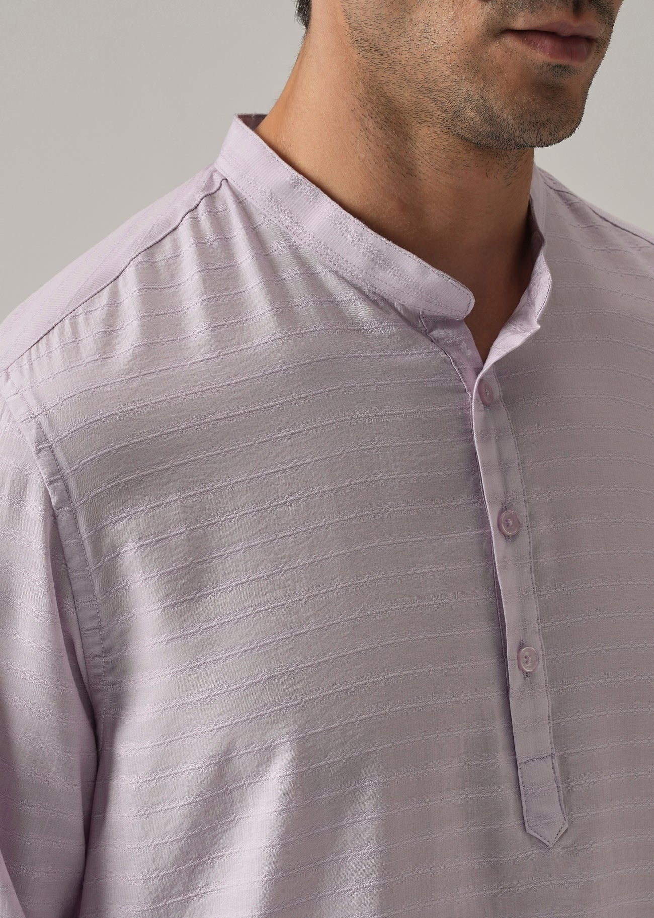 The Lavender Self-Stripe Kurta combines a clean traditional silhouette with subtle woven texture. The self-stripe pattern adds depth to the solid lavender base, making it suitable for festive gatherings, cultural events, and smart casual ethnic wear.