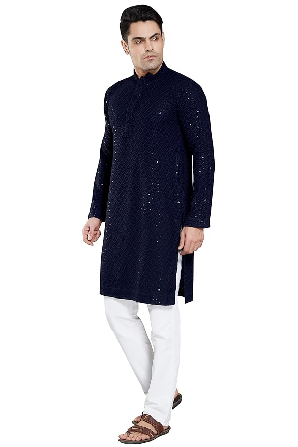 Men’s slim-fit embroidered kurta featuring sequin and thread detailing in a navy blue cotton blend fabric. Knee-length design with full sleeves and collared neckline. Kurta only; bottomwear not included.