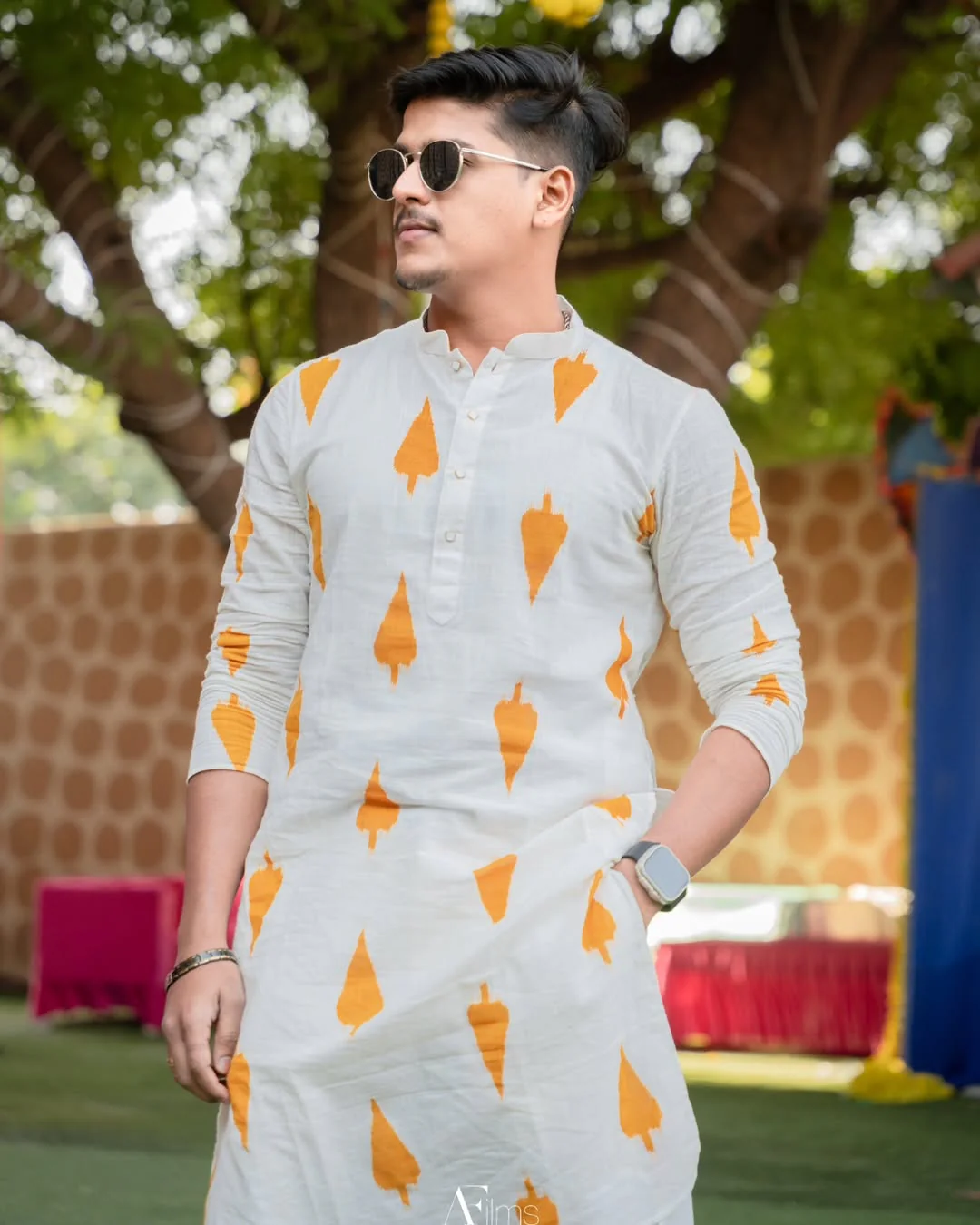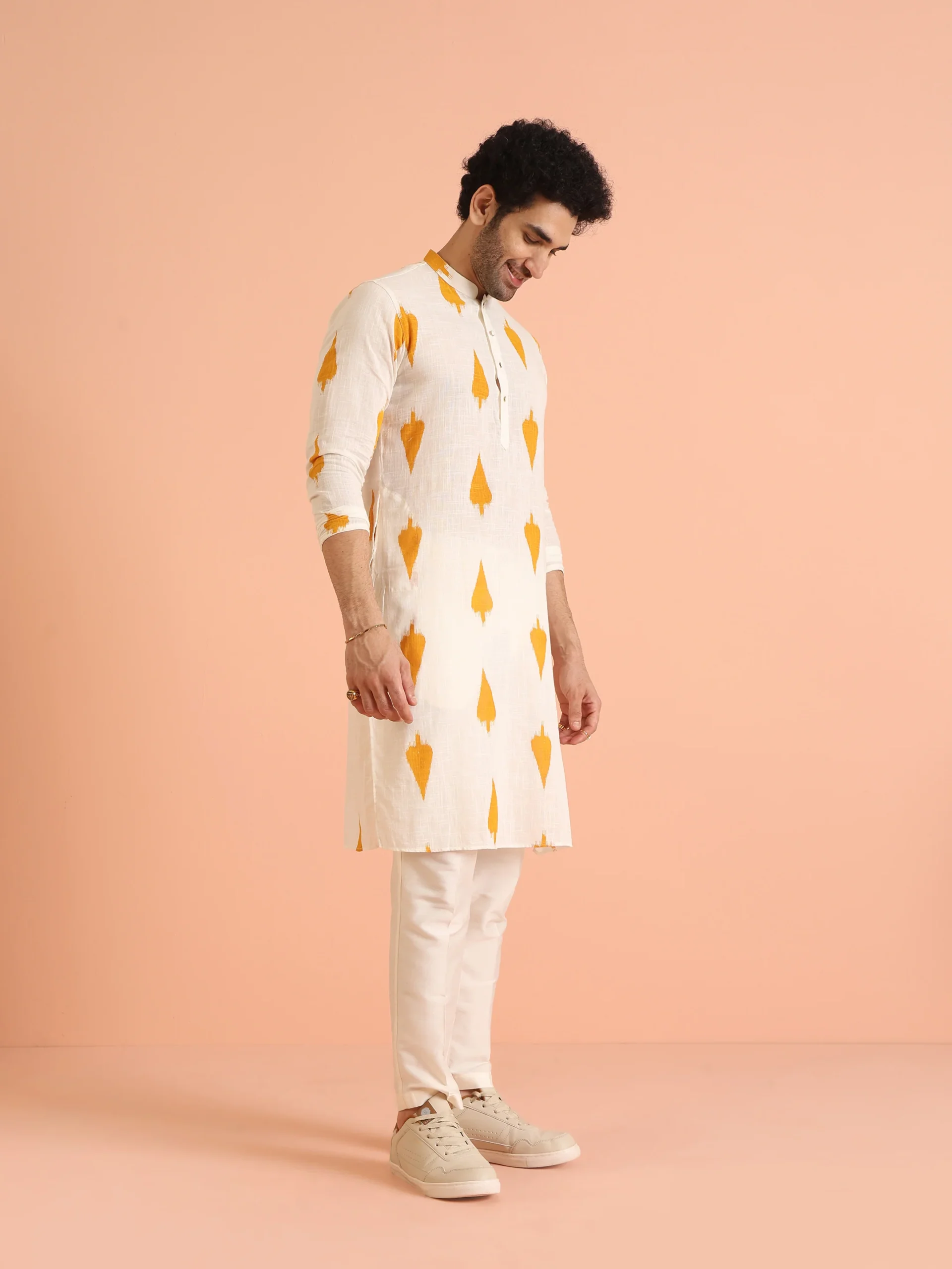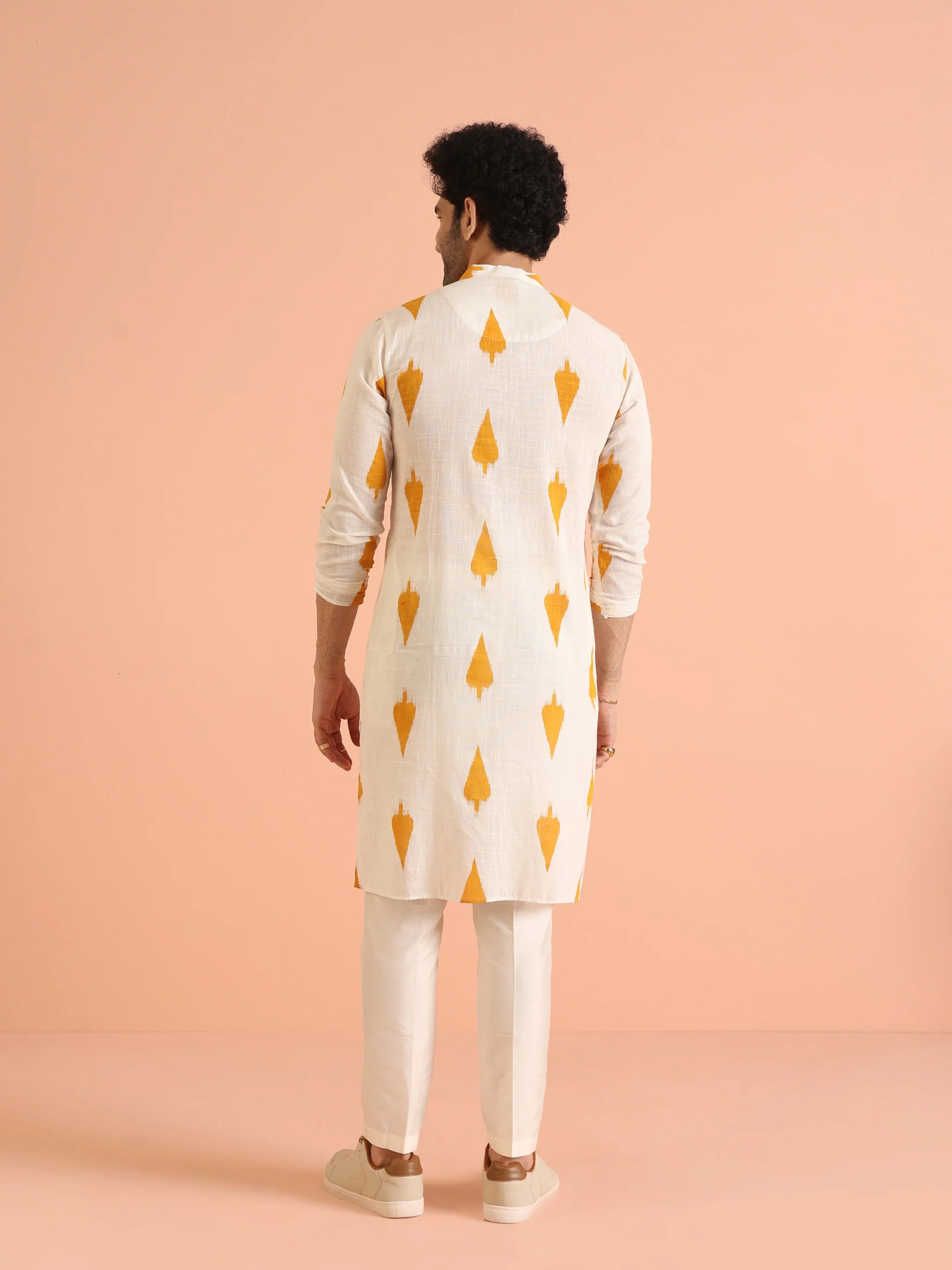 This White Cotton Blend Kurta with Mustard Ikat Print combines classic ethnic styling with eye-catching geometric motifs. The regular fit and breathable cotton blend fabric make it ideal for festive celebrations, casual gatherings, and cultural events.